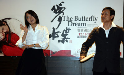 中新網(wǎng)11月2日電 據(jù)“中央社”報道,臺灣當代傳奇劇場新創(chuàng)昆曲風歌劇《夢蝶》十二月十三至十六日將在戲劇院演出。在昨天的記者會中,作為男女主角的京劇名角吳興國(右)與昆曲名伶錢熠(左)現(xiàn)場表演一段“搧墳女與莊周”。