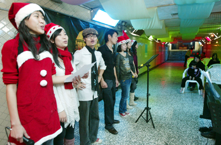 臺灣師范大學前師大路、和平東路口的“師大和平地下道”再度變身,二十日晚間舉行“圣誕老人從地底竄出——圣誕百老匯音樂狂歡夜”,學生演出圣誕音樂劇及歌曲,過往民眾享受節(jié)日氣氛!爸醒肷纭眻D 孫仲達 攝