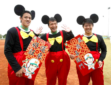 臺灣職業(yè)棒球明星投手(右起)林其緯、蔡明晉、沈福仁,十六日在球場春訓開訓典禮中,搞笑巧扮米老鼠,向球迷拜早年,并期許球隊鼠年再創(chuàng)巔峰。臺灣《中國時報》圖 蔡明德 攝