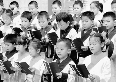 60位身著古代學(xué)生服的學(xué)童,齊聲誦讀《弟子規(guī)》;大陸絲竹名家塤琴合奏《幽蘭操》。朗朗童聲,悠悠古樂,回蕩在古樹參天、屋宇儼然的孔廟。