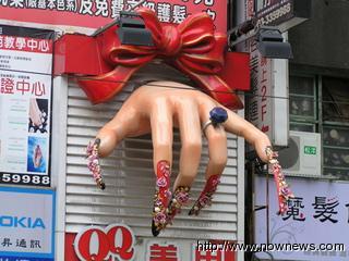 中新網(wǎng)6月23日電 據(jù)臺灣“今日新聞”報道,桃園市某家美甲業(yè)者招牌頗具創(chuàng)意,一只巨大的左手正高高掛在店門之上,還特別做個蝴蝶結,宛如天上掉下來的禮物,每當民眾經(jīng)過此店,總是會留意一下如同仙女般的左手。