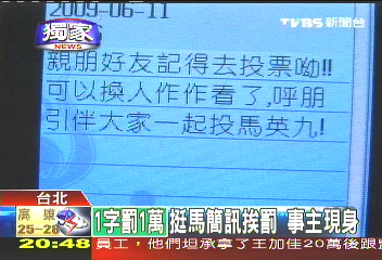 據(jù)臺(tái)灣TVBS電視臺(tái)報(bào)道,去年臺(tái)灣地區(qū)領(lǐng)導(dǎo)人選舉投票當(dāng)天,一名馬英九支持者發(fā)送了一則50字短信幫馬助選,事后因違反島內(nèi)選舉規(guī)定,被罰50萬元(新臺(tái)幣,下同),成為臺(tái)灣史上最貴的短信,1字等于1萬元。這名男子黎煌雷昨天接受媒體訪問,認(rèn)為傳短信是私人行為,并沒有公開助選,因此不服處罰。