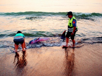 金山派出所昨天清晨5時接獲婦人報案,指出水尾沙灘有海豚擱淺。警員郭光明趕到現(xiàn)場察看,發(fā)現(xiàn)海豚困在沙灘,腹部擦傷滲血;郭與發(fā)現(xiàn)婦人想一起把海豚推回海里,但太重,而且海豚緊張地從噴氣孔噴氣,兩人擔心弄傷海豚,不敢再動。