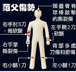 范姓少年一開燈、林就持鋁棒重?fù)羰焖械姆陡割^部,連續(xù)敲打四、五下;范見父親抱頭抵擋,即持西瓜刀朝他身上一陣猛砍,因用力過猛,連刀柄都砍斷了,直到父親不支倒地才罷手。