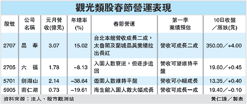 劍湖山集團總經(jīng)理張錦榮表示,雖受天氣影響,使得游園人數(shù)并未大幅成長,但由于春節(jié)天數(shù)長,今年劍湖山業(yè)績和去年相較,應(yīng)可維持平盤,如再加上劍湖山王子飯店仍有不少人入住,營收可維持平盤。