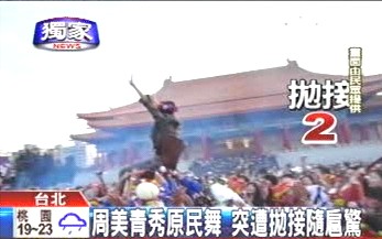 中新網(wǎng)3月2日電 據(jù)臺(tái)灣TVBS報(bào)道,馬英九夫人周美青1日欣賞音樂(lè)劇演出,一時(shí)興起,親自跳起少數(shù)民族舞蹈。周美青跳舞跳得忘情,還四度被舞者拋向天空,讓現(xiàn)場(chǎng)民眾見(jiàn)識(shí)周美青活潑的一面。