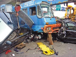 中新網(wǎng)4月17日電 據(jù)臺灣《中國時(shí)報(bào)》報(bào)道,臺灣男子呂昭明十六日傍晚駕駛二十噸吊車,疑因剎車失靈,連續(xù)追撞十一輛汽車及摩托車,導(dǎo)致騎摩托車的母親蔡阿櫻重傷、讀高中的女兒陳亭婷與初中的兒子陳柏翰當(dāng)場死亡,另有五人輕傷,車禍現(xiàn)場怵目驚心。