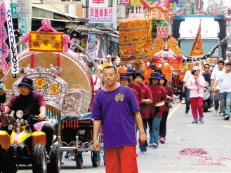 中午時分,臺北縣圣母宮的10輛游覽車又載另一批信眾來到,加上隨行自己開車的信眾,人車將延平老街擠得滿滿的;廟前進香后,到廟后臨時搭建的棚架下吃午餐,信眾就這樣進出一下午。