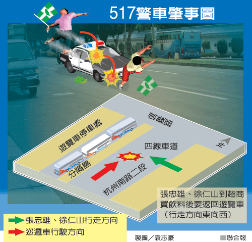 張忠雄、徐仁山在跨越杭州南路車道時,突遭同由杭州南路南向北行駛的巡邏車撞上,張忠雄被撞后彈落到巡邏車擋風玻璃上,再滾落地面。由于撞擊力大,巡邏車的擋風玻璃碎裂,原本行駛在內側第二車道的巡邏車,也偏向最內車道緊急煞車。