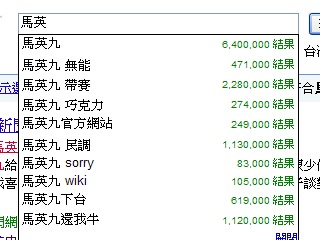 記者實(shí)際在Google上網(wǎng)搜尋,以馬英九為例,才打上“馬英”二個(gè)字,Google搜尋網(wǎng)頁上赫然自動(dòng)跳出“馬英九,無能”,或是“馬英九,帶賽”等搜尋建議條件;在雅虎奇摩進(jìn)行同樣搜尋時(shí),則有十項(xiàng)搜尋建議產(chǎn)生,但無“無能”或“帶賽”的搜尋建議。