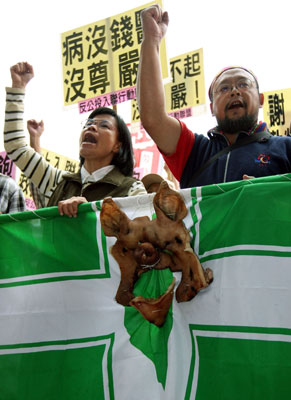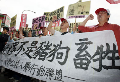 抗議者還利用豬頭道具,反諷民進(jìn)黨參選人謝長廷日前有關(guān)“人不能只重視吃飯問題,否則就像只會吃和睡的豬狗等畜牲”的言論,質(zhì)疑謝長廷,“難道不食人間煙火?”