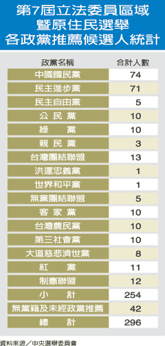 首次采單一選區(qū)兩票制的第七屆“立委”選舉,區(qū)域“立委”與原住民方面將選出79席,共16個(gè)政黨推薦254人參選,無(wú)黨籍及未經(jīng)政黨推薦的有42人。