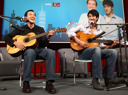 據(jù)“中央社”報道,馬英九穿著牛仔褲和Polo衫和王力宏合唱英文歌曲《I Understand》。馬英九說,這是他高三時花了一百七十多元買的吉他,練的第一首歌曲。王力宏則從未聽過此曲,他笑著說,先前還熱心找了一些“老歌”,沒想到在馬英九眼里全是“新歌”。