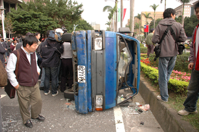為了大中至正的匾牌,臺北中正紀(jì)念堂整個上午依舊沖突不斷,廣場氣氛異常緊張。為了控制場面,警方在上午十一點多舉牌要求民眾解散。此時,一輛藍(lán)色貨車突然在全速沖撞媒體記者的工作區(qū),王瑞璋更遭貨車壓住,現(xiàn)場同業(yè)和民眾趕緊搬起貨車,救出壓在貨車下面的王瑞璋。
