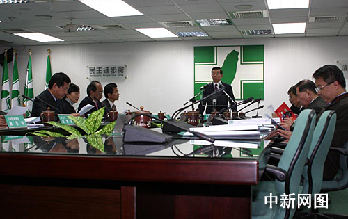 一月十六日,民進(jìn)黨召開“立委”選舉后的首次中常會(huì)。圖為會(huì)議現(xiàn)場(chǎng)。中間為新任民進(jìn)黨主席的謝長廷正在主持會(huì)議。作者:陳立宇