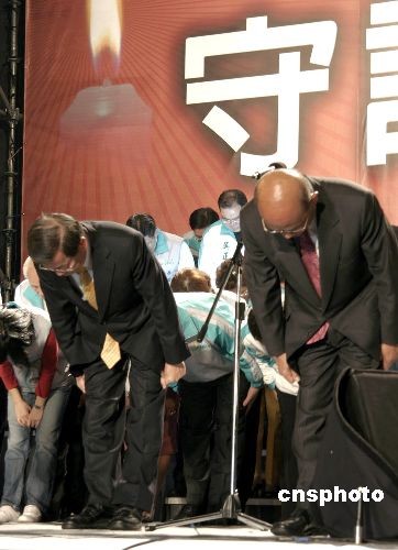 中新網(wǎng)3月22日電 據(jù)臺灣東森新聞報(bào)道,民進(jìn)黨輸?shù)?008年“大選”,謝蘇配大敗,得票與對手馬蕭相差超過220萬票,謝長廷7點(diǎn)半上臺,向支持者致歉和致謝。