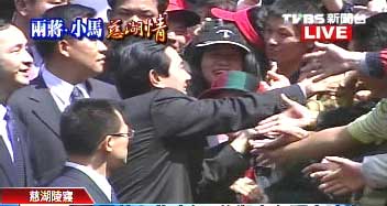 報(bào)道說(shuō),在民眾熱烈的歡呼聲中,馬英九、蕭萬(wàn)長(zhǎng)抵達(dá)蔣介石慈湖陵寢。馬英九以微笑回應(yīng)民眾,并與民眾握手、打招呼。
