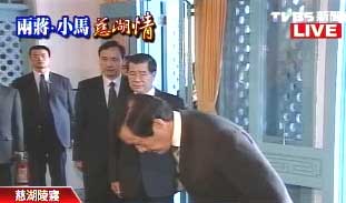 在蔣介石靈前,馬英九眉頭深鎖,行三鞠躬禮,一旁陪同的有準(zhǔn)副手蕭萬(wàn)長(zhǎng)、桃園縣長(zhǎng)朱立倫。馬英九表示,蔣介石、蔣經(jīng)國(guó)的功過(guò)都可以討論,而不該一味崇拜或打壓。