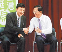 陳水扁與余天(左)會(huì)面。(圖:臺(tái)灣《蘋(píng)果日?qǐng)?bào)》)