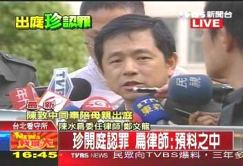 中新網(wǎng)2月10日電 據(jù)臺灣TVBS報道,陳水扁夫人吳淑珍今天(10日)出庭應(yīng)訊,當(dāng)庭承認(rèn)偽造文書和洗錢罪,對此,陳水扁委任律師鄭文龍表示,早在預(yù)料之中。