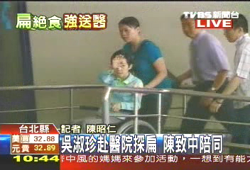 中新網(wǎng)5月11日電 據(jù)臺灣TVBS報道,陳水扁因為絕食身體虛弱遭到強制送醫(yī),目前仍在臺北縣立板橋醫(yī)院接受治療。陳水扁夫人吳淑珍偕同兒子陳致中11日上午來醫(yī)院特見陳水扁。