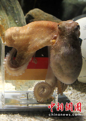據(jù)悉,海洋館員把分別印有德、阿旗幟的貝殼放入玻璃缸,與對英格蘭隊比賽前脆快取出德國那枚貝殼不同,章魚“保羅”對德國和阿根廷的對決有些“猶豫不決”,“考慮了長達(dá)一小時”但是最終還是取出了印有德國旗幟玻璃缸里的貝殼。