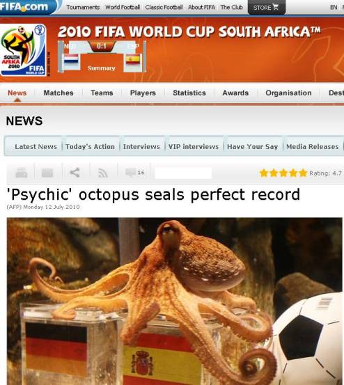 章魚保羅預(yù)測決賽中西班牙將擊敗荷蘭隊(duì)奪冠。雖然比賽被拖到加時(shí)的116分鐘,但伊涅斯塔的進(jìn)球還是讓保羅的神奇再次延續(xù),這也是它在本屆世界杯上成功預(yù)測的第8場比賽,而且其預(yù)測成功率為100%!它所預(yù)測的比賽,除了這場決賽,還有德國隊(duì)的全部七場比賽。