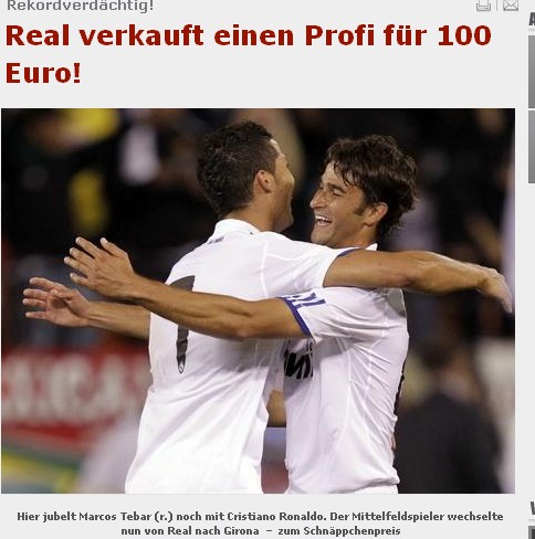 繼去年收購C羅花掉9400萬歐元?jiǎng)?chuàng)下世界足球歷史最高轉(zhuǎn)會(huì)費(fèi)紀(jì)錄之后,皇馬有望再次創(chuàng)造歷史。預(yù)備隊(duì)、現(xiàn)丙級(jí)聯(lián)賽球隊(duì)皇馬卡斯蒂亞隊(duì)球員馬克斯-特巴爾將以100歐元的價(jià)格被賣到西乙球隊(duì)赫羅納,圖片報(bào)稱,100歐元的轉(zhuǎn)會(huì)費(fèi)有可能成為世界職業(yè)足壇歷史最低身價(jià)。