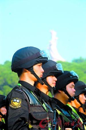 誓師大會上,60名特警隊(duì)員佩戴防暴頭盔配護(hù)目鏡,穿作訓(xùn)服、作訓(xùn)背心、作戰(zhàn)手套,帶10頭警犬,持微型沖鋒槍、狙擊步槍,顯得威風(fēng)凜凜。而另外的4個(gè)武警安保方隊(duì)、4個(gè)邊防安保方隊(duì)、消防安保方隊(duì)、防恐處突安保方隊(duì)、陸軍方隊(duì)、海軍方隊(duì)、空軍方隊(duì)也分別亮相。
