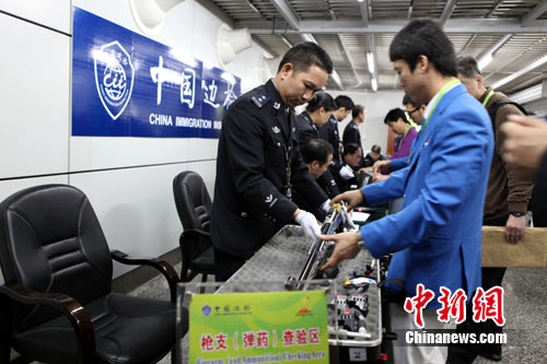 中新網(wǎng)廣州11月9日電 (唐貴江 張瑞)記者今日從廣州白云出入境邊防檢查站獲悉, 11月8日該口岸迎來第一次槍彈入境高峰,印度、越南、韓國等10個(gè)國家的射擊比賽運(yùn)動(dòng)員攜帶各類比賽用槍和比賽用子彈入境。