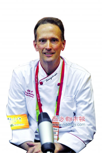 這名身高1 .95米的美國“總廚”,自2008年北京奧運會后便定居中國,去年12月份還把家安在了廣州,喜歡吃燒鵝,也習(xí)慣在飯后喝上一碗雙皮奶當(dāng)甜品!暗 ,中國菜能進亞運菜單絕不是我一個人說了算”。