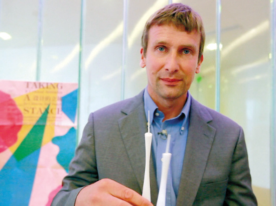 11月14日晚,廣州新電視塔頂層,在這個(gè)尚未開(kāi)放的區(qū)域,這座“小蠻腰”的設(shè)計(jì)師馬克(MARK HEMEL,見(jiàn)上圖)接受了羊城晚報(bào)記者專訪。馬克的記憶,還停留在亞運(yùn)開(kāi)幕式那晚電視塔璀璨奪目的那刻,他既驚嘆又感慨,連連稱:“‘女兒’終于出閣了!”