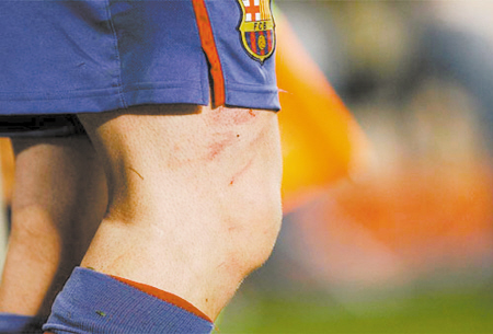 梅西大腿上被鞋釘刮傷的血痕。 圖片來源:成都商報
