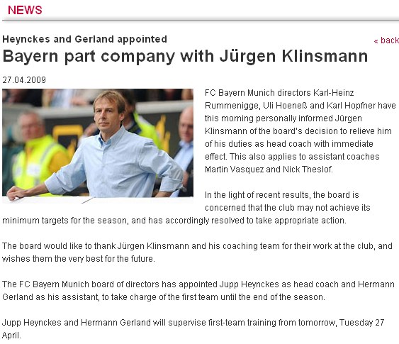 拜仁慕尼黑隊(duì)的聲明說,拜仁的主管魯梅尼格等高管27日一早已經(jīng)通知了克林斯曼,俱樂部管理層已經(jīng)決定將其解職,該解職令即刻生效。同時被解雇的,還有克林斯曼的助理教練巴斯克斯(Martin Vasquez )以及特斯洛夫(Nick Theslof)。