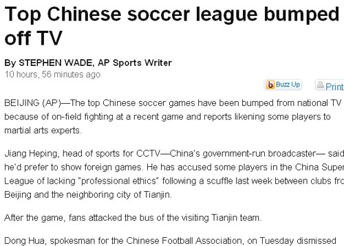 美聯(lián)社文章稱(chēng),中國(guó)足球的頂級(jí)聯(lián)賽已經(jīng)被“踢出”國(guó)家電視臺(tái)的節(jié)目單,因?yàn)樽罱舆B不斷的球場(chǎng)暴力,在媒體報(bào)道中甚至被稱(chēng)作“武術(shù)選手”。文章援引了央視體育頻道總監(jiān)江和平的說(shuō)法稱(chēng),他更希望播出外國(guó)的體育節(jié)目!白罱谐(lián)賽非;靵y,有一些球員缺乏職業(yè)素質(zhì),”他指的是上周北京國(guó)安和天津泰達(dá)隊(duì)的比賽中,兩隊(duì)球員爆發(fā)了群毆事件,賽后一些球迷還襲擊了客場(chǎng)作戰(zhàn)的天津隊(duì)的大巴。