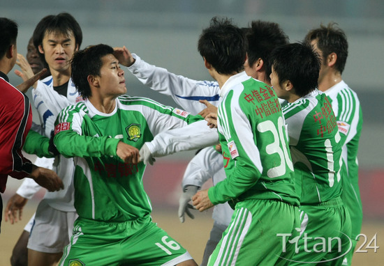 一波未平一波又起,幾分鐘后比賽結(jié)束。雙方球員退場之際又起口角,泰達小將蒿俊閔豪言欲先斬國安郭輝為快,后者不堪其辱老拳想向,又是悍將多烏達斜刺里殺出,一記化骨綿掌命中郭輝面頰。隨后兩隊不分主力替補教練,紛紛投入最后的大比武,將“豐臺武館”內(nèi)的氣氛推向了最高潮。(本組稿件部分圖片來源于網(wǎng)絡(luò))
