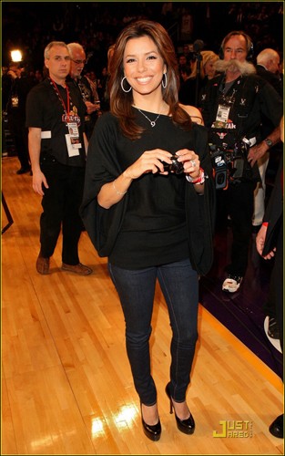 我們的絕望主婦伊娃·朗格利亞看來也是籃球迷啊,在NBA全明星賽的賽場看到了身穿黑色蝙蝠衫的伊娃·朗格利亞,性感的露肩款,配上緊身牛仔褲,高跟鞋,閃亮的大耳環(huán)熠熠生輝,連NBA的球星都爭著和她合影留念。