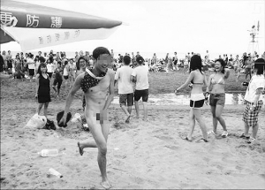 在網(wǎng)絡(luò)上,一張名為“火箭勝湖人,深圳球迷被迫裸奔”的貼圖瘋傳。發(fā)帖者稱,此深圳球迷王×,乃湖人當(dāng)家球星科比的粉絲,之前在網(wǎng)上揚言火箭勝湖人他就裸奔,不幸言中,被網(wǎng)友們?nèi)巳馑阉,要求他兌現(xiàn)承諾。發(fā)帖者甚至稱要求王×裸奔的還有其女友,因女友乃不折不扣的火箭球迷。王×在重重壓力之下遂面對現(xiàn)實,兌現(xiàn)承諾。于是5月5日下午的大梅沙海濱沙灘上,出現(xiàn)這樣一幕場景:一名男子脖套花內(nèi)褲,手捂下體,向大海奔去,臉帶幾分笑意,幾分羞澀。