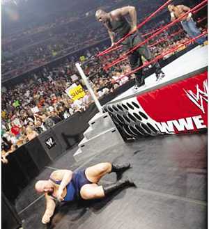 奧尼爾的摔角可能還會(huì)有續(xù)集。他并不是第一個(gè)走上職業(yè)摔角擂臺(tái)的球員,卡爾·馬龍和羅德曼曾經(jīng)在這里交手過。 (吳哥)
