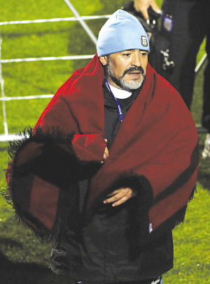 當(dāng)阿根廷隊(duì)剛剛結(jié)束訓(xùn)練,馬拉多納一行正要返回更衣室,這時(shí)兩個(gè)來(lái)自薩爾塔市(布宜諾斯艾利斯以北的小城)的阿根廷記者走了過(guò)來(lái)向老馬講述了他們長(zhǎng)途跋涉帶來(lái)禮物和祝福的故事,馬拉多納本來(lái)是快步走向更衣室的,聽到記者的故事立刻停了下來(lái)!斑@是來(lái)自San Antonio de Los Cobres,一個(gè)海拔4000米小城孩子們的禮物,他們托我們?yōu)槟銕?lái)了毯子!甭牭竭@里馬拉多納的真性情顯露無(wú)遺,接過(guò)毯子立刻披在了身上。這個(gè)被提到的小城叫做 San Antonio de los Cobres,距薩爾塔市約180公里,距布宜諾斯艾利斯約1750公里,海拔高達(dá)4000米,那里的球迷無(wú)法通過(guò)電視來(lái)觀看世界杯的比賽,但是他們一樣喜歡馬拉多納,關(guān)注阿根廷隊(duì)。許凱 黃啟元 本報(bào)南非專電