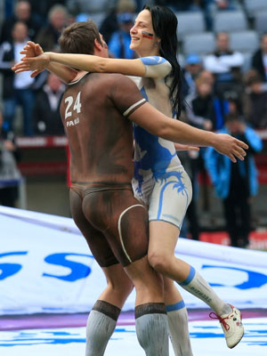 德乙聯(lián)賽第22輪,慕尼黑1860在主場(chǎng)以5:1大勝圣保利。 終場(chǎng)前從主客兩隊(duì)的看臺(tái)上分別躍下一個(gè)身穿1860隊(duì)服的姑娘和一個(gè)身穿圣保利隊(duì)服的小伙,兩人一路狂奔來(lái)到球場(chǎng)中圈,旁若無(wú)人的熱吻起來(lái)。仔細(xì)觀察才能發(fā)現(xiàn)他們所穿的“隊(duì)服”的奧秘----這對(duì)情侶都只穿了一條內(nèi)褲,他們身上的衣衫完全是足以亂真的人體彩繪,F(xiàn)場(chǎng)保安也為這浪漫一幕所感動(dòng),他們面帶微笑將這對(duì)情侶請(qǐng)出草坪。(圖片來(lái)源:1860隊(duì)官方網(wǎng)站)