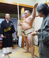 下午4點(diǎn)半過后,來到工作室的朝青龍笑著說:“這是第一次,所以很緊張。我會努力的!背帻埾瞪习咨鄵溲鼛,右手持寶棒,左手抬起,擺出憤怒的表情,拍下了照片。