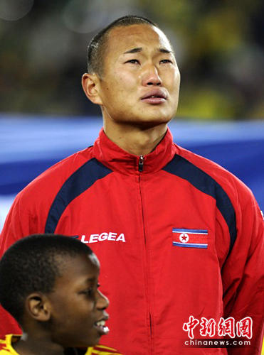 現效力于日本聯賽的朝鮮球員鄭大世在奏響朝鮮國歌時留下了熱淚,激動之情讓現場記者矚目。場邊的攝像記者特地兩次將鏡頭對準鄭大世,記錄下這位“朝鮮魯尼”的激動瞬間。