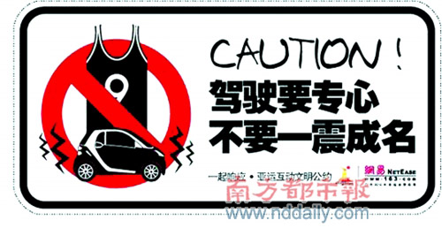 在剛剛結(jié)束的車展上,網(wǎng)易為推廣《亞運(yùn)文明公約》,特推出了一套以“孫悅車震事件”為主題的搞笑車貼向觀眾派發(fā)。車貼上寫著:駕駛要專心,不要一震成名。現(xiàn)場(chǎng)不少參觀者看到“孫悅車貼”后,都忍不住咧嘴偷笑。