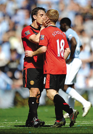 筆者記得就在去年9月,媒體還拍攝到兩人一起觀看板球比賽的照片,甚至兩人還曾攜家?guī)Э谝煌燃。既然兩人有如此親密的“隱情”,因此在昨天斯科爾斯絕殺曼城后,內(nèi)維爾作出激吻“老相好”斯科爾斯的斷背舉動(dòng),自然也就不足為奇。