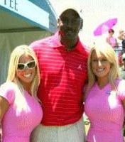 近日,喬丹在一項(xiàng)高爾夫比賽中仍然是“一個(gè)人”,不過,他與場(chǎng)邊的兩位身著粉紅套裝的金發(fā)大波美眉打得火熱,美國八卦媒體報(bào)導(dǎo)時(shí)還聲稱,喬丹是與這兩位大胸艷女一起離開,并在文章中感嘆:喬丹永遠(yuǎn)都是偉大的。