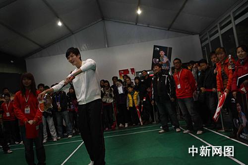 中新網(wǎng)上海十一月二十三日點(宗晨亮)日前,中國羽毛球名將鮑春來來到“2009李寧・中國羽毛球公開賽”球迷體驗區(qū),和球迷們進行了互動活動,還為大家簽名留念。有意思的是,小鮑的球迷多數(shù)都是女性,主持人也拿此事和他開玩笑。