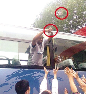 5月23日晚上,湖南湘西某地有關(guān)方面邀請美國體育使者男子明星籃球隊與立陶宛蘇托瓦職業(yè)男子籃球隊在該地體育館舉行對抗賽。賽前,兩支球隊分別到當(dāng)?shù)氐囊恍┲袑W(xué)進(jìn)行訪問,然而,在5月22日美國體育使者男子明星籃球隊到市第一中學(xué)訪問時出現(xiàn)讓人憤怒的一幕,一美國球員在車輛離開校園時打開窗戶,向圍觀的中學(xué)生撒人民幣,造成現(xiàn)場一度失控。