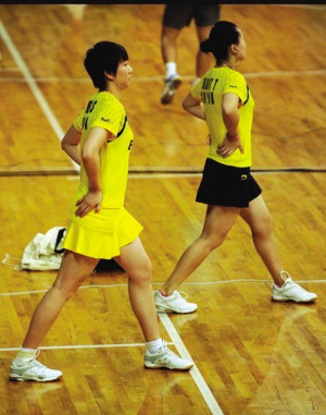 網(wǎng)球場上女選手穿著短裙打球已經(jīng)蔚然成風,羽毛球場上的美少女們還處于“遮遮掩掩”的狀態(tài),穿裙子比賽的遠遠少于穿褲裝的。不過也有勇于“嘗試”的,昨日中國隊里的女雙組合張亞雯和趙婷婷、成淑和趙蕓蕾都穿上了裙裝——張亞雯、趙婷婷穿的是黑衣紅裙,成淑、趙蕓蕾則是黃色裙子。不知是否是穿著裙裝更利落,兩對組合都輕松挺進女雙八強。