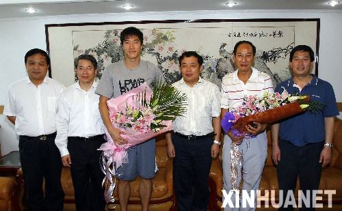 上海莘莊訓(xùn)練基地,上海市普陀區(qū)委書記周國(guó)雄等人當(dāng)日代表普陀父老鄉(xiāng)親為即將出征全運(yùn)會(huì)的劉翔壯行——?jiǎng)⑾枋恰巴辽灵L(zhǎng)”的普陀人;疑玊恤,灰色短褲,踏一雙亮黃色的運(yùn)動(dòng)鞋,剛睡過(guò)午覺(jué)的劉翔看起來(lái)氣色不錯(cuò)。